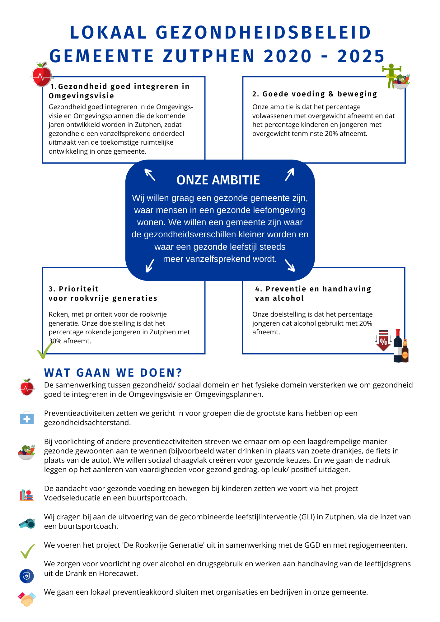 - Gezondheid goed integreren in de Omgevingsvisie - Gezondheid goed integreren in de Omgevingsvisie en Omgevingsplannen die de komende jaren ontwikkeld worden in Zutphen, zodat gezondheid een vanzelfsprekend onderdeel uitmaakt van de toekomstige ruimtelijke ontwikkeling in onze gemeente.
