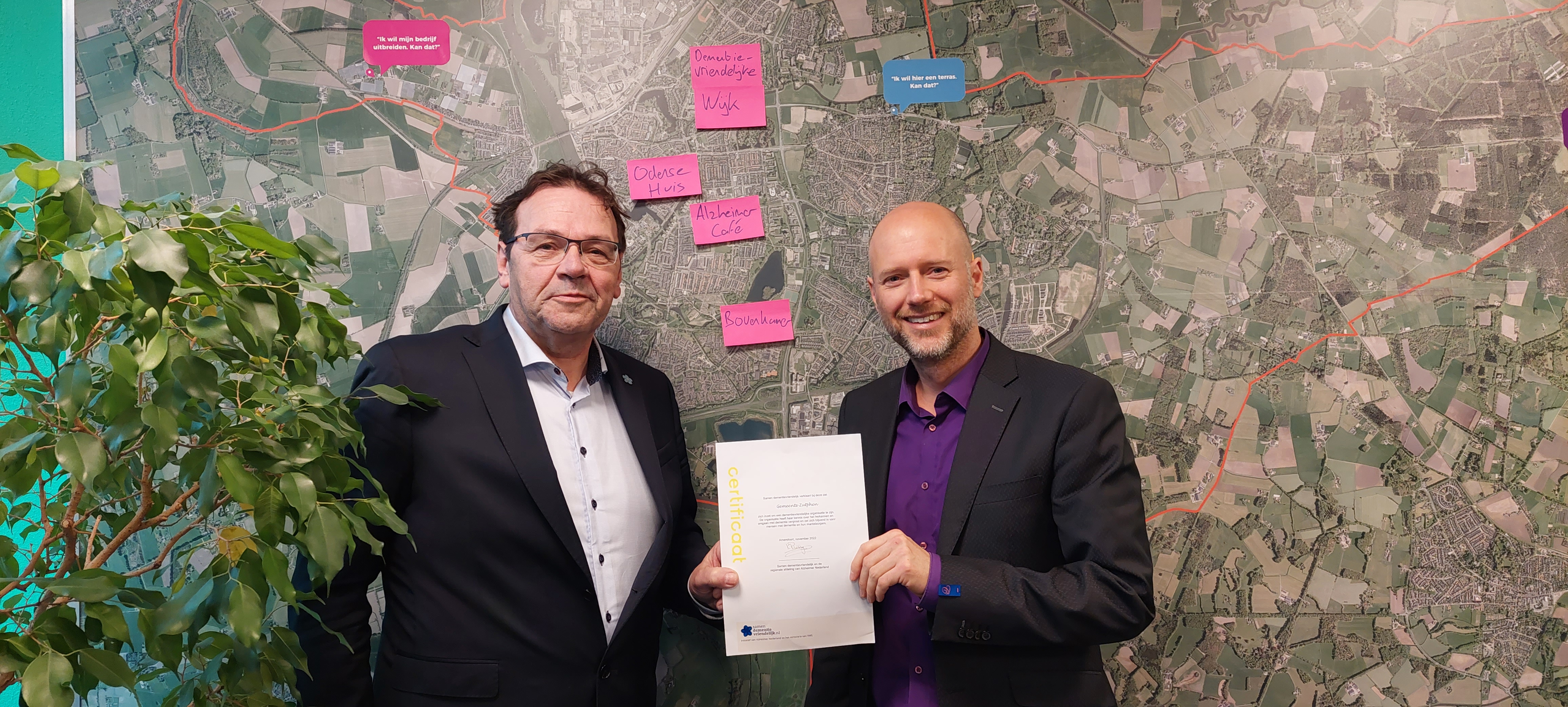 Wethouder Jasper Bloem ontving het certificaat uit handen van Freek Jansen, voorzitter Alzheimer Nederland afdeling Oost Gelderland.
