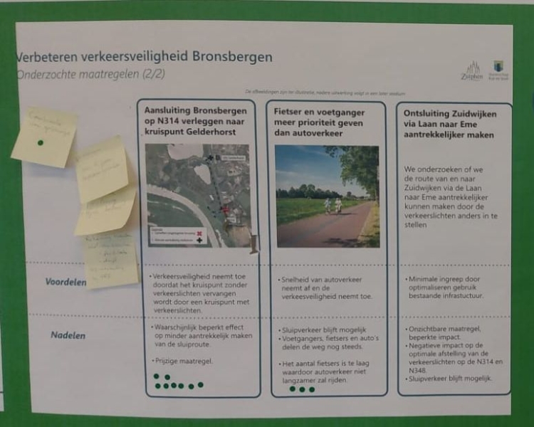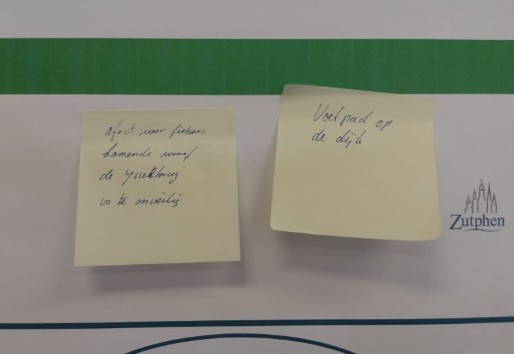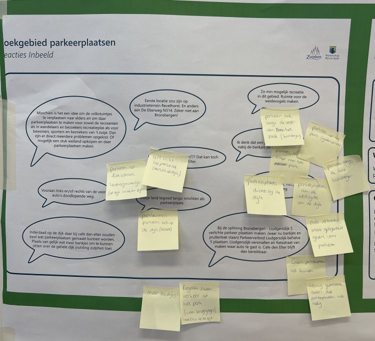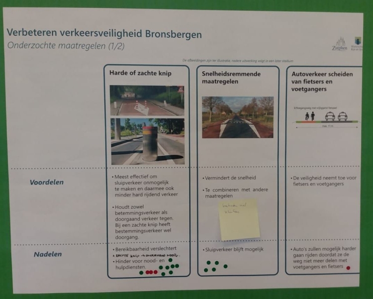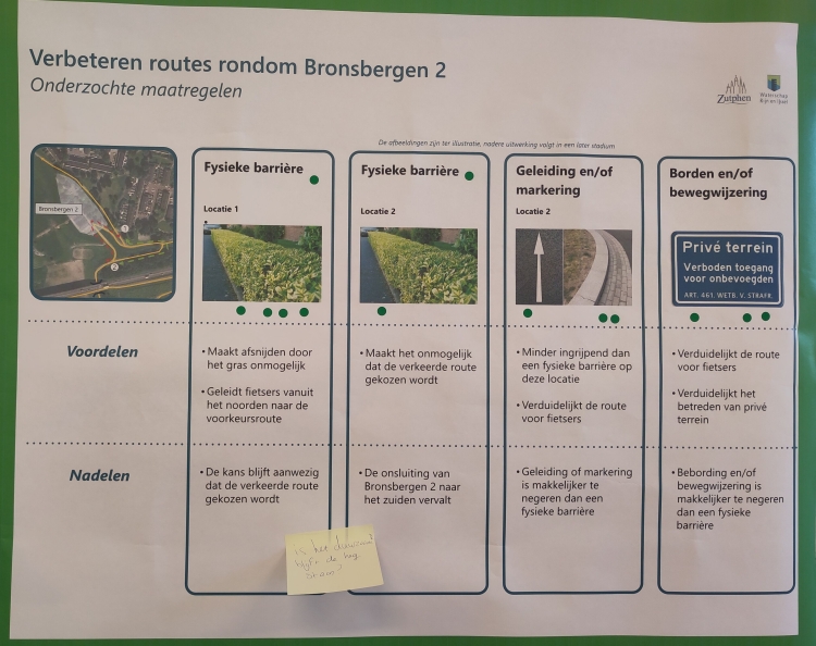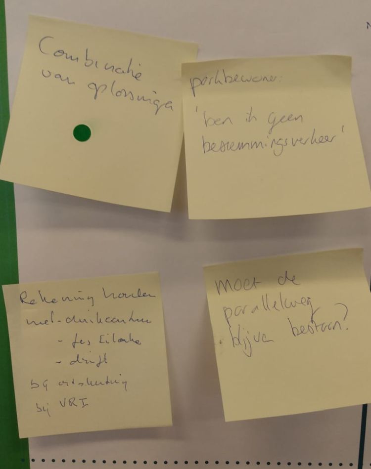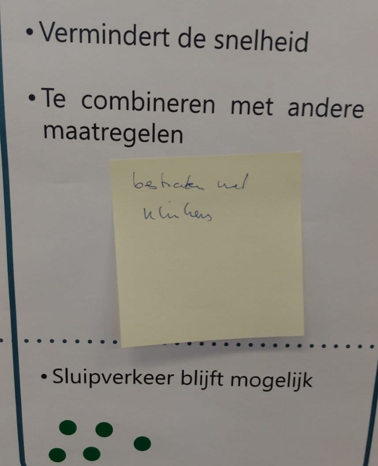 Bij de bijeenkomst konden de aanwezigen hun reactie geven op de informatie. Soms door dit op een geeltje te schrijven, soms door rode of groene stickers te plakken. Deze reacties hebben we meegenomen in de verdere uitwerking. Maar ze waren niet bedoeld om ‘te stemmen’. Dus meer rood dan groen betekende niet: we gaan het niet doen.