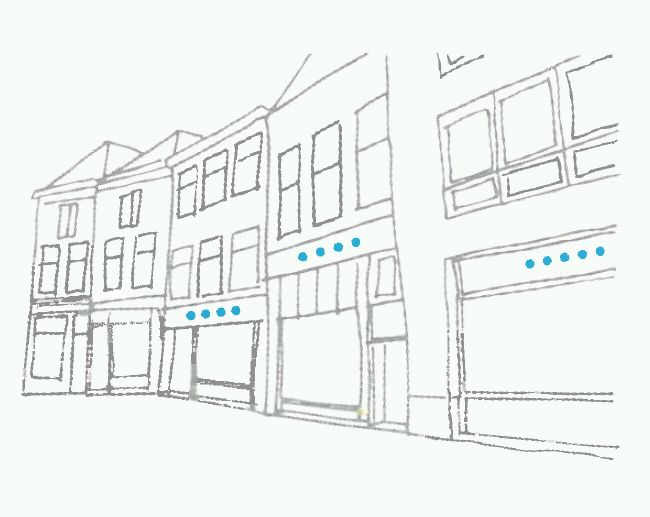 - Plaats reclame onder de ramen van de eerste verdieping. Stem reclame af op gevelkarakteristiek en maak een relatie met de winkelpui en entree.
